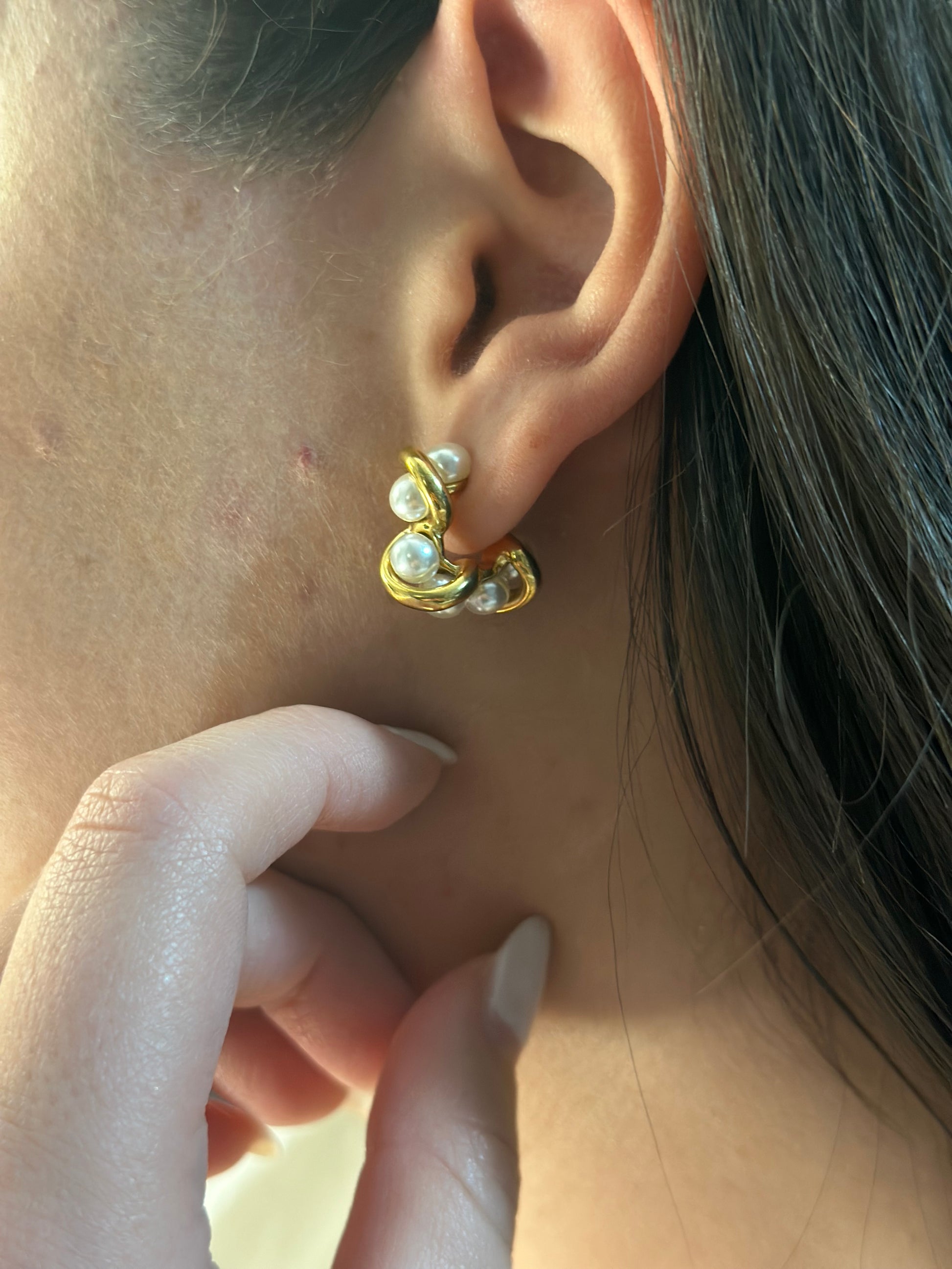 Pair of stainless steel earrings, hypoallergenic, with pearls, water resistant.
